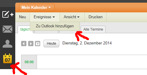 2. Öffnen sie zum Beispiel ihren Kalender wenn sie diesen in Outlook integrieren möchten und wählen sie bei "Ereignisse" den Punkt "Zu Outlook hinzufügen" aus.
