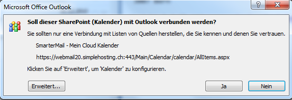 5. Es wird je nach Version von Outlook nochmals eine Meldung kommen ob sie dies nun verbinden möchten. Bestätigen sie dies mit Ja.