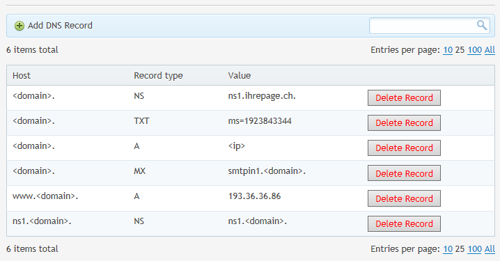 Hier einige Beispiele von möglichen DNS Einträgen im DNS Template. Gerne helfen wir Ihnen auch ein solches DNS Template zu erstellen: