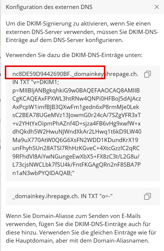 5. Kopieren sie den eingerahmten Bereich in ein Texteditor wie auch ebenfalls der Teil welcher mit "v=DKIM; anfängt bis zu ".