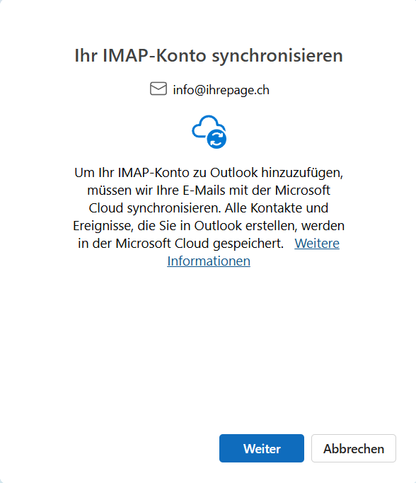 6. Outlook ruft Ihre E-Mails nicht direkt von unserem Server ab, sondern synchronisiert diese über die Microsoft-Cloud. Bestätigen Sie, dass Sie damit einverstanden sind, und klicken Sie auf «Weiter».