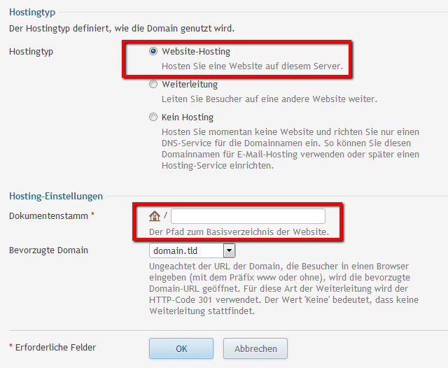 3. Geben Sie den Domainnamen an und wählen Sie als  Hostingtyp "Website-Hosting" aus