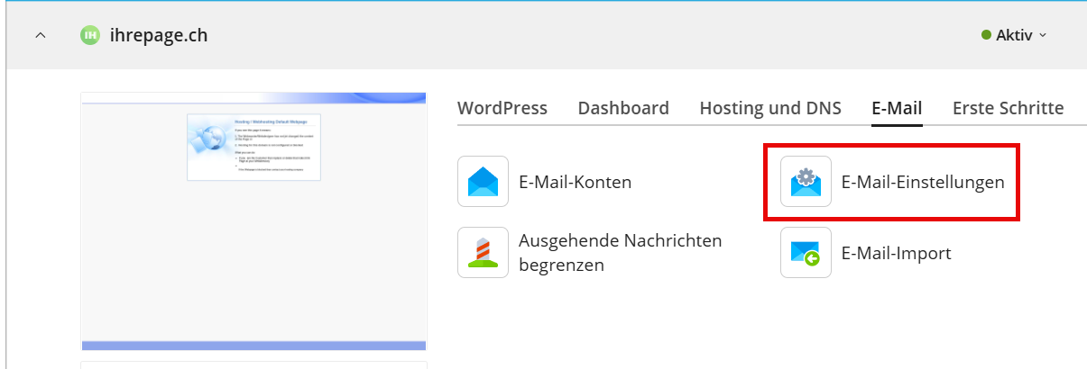 1. Gehen Sie zu Websites & Domains > Ihre Domain > Tab „E-Mail“ > E-Mail-Einstellungen.