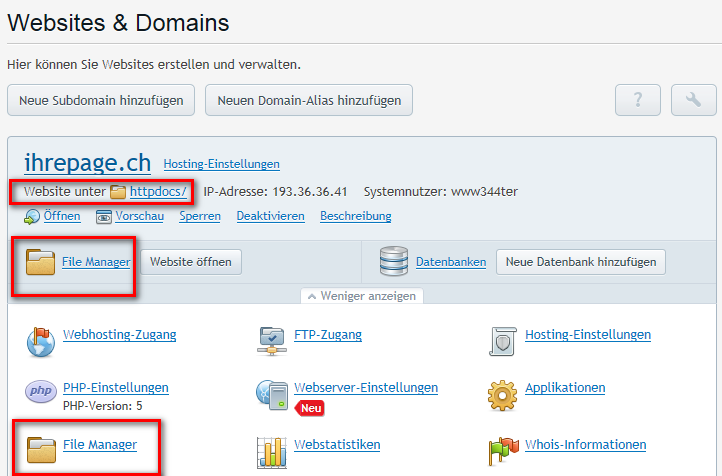 2. Im Hauptmenü wählen sie den Button "httpdocs" aus oder einen der "File Manager".